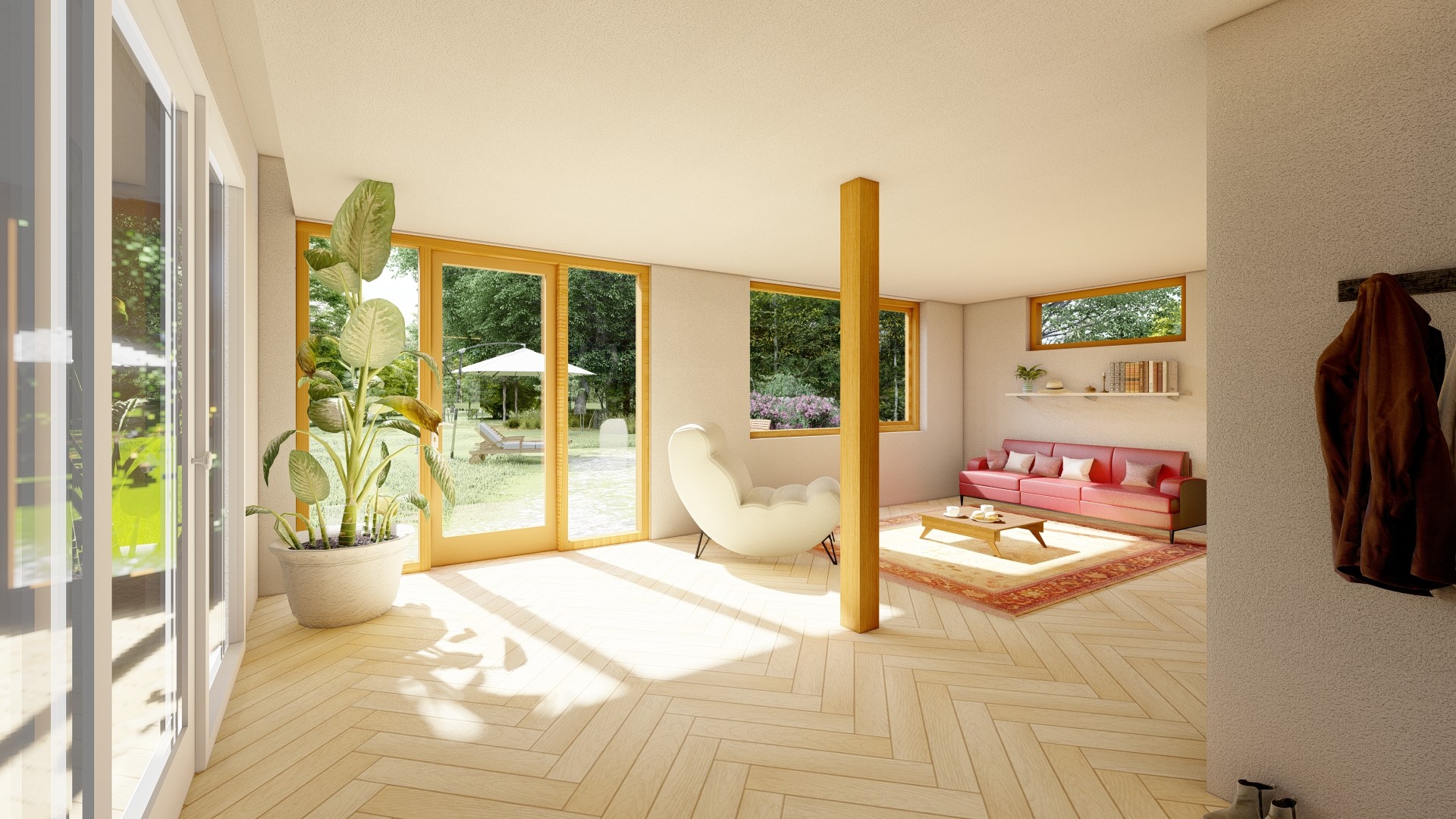 De aanbouw is volledig in houtskeletbouw uitgevoerd. De opdrachtgever isoleert zelf met houtvezel of inblaasstro voor een gezonde, dampopen opbouw. In de leefruimtes zorgen leemstucwanden voor een warme, natuurlijke sfeer, terwijl de slaapkamers boven worden afgewerkt met dampopen houten platen.
