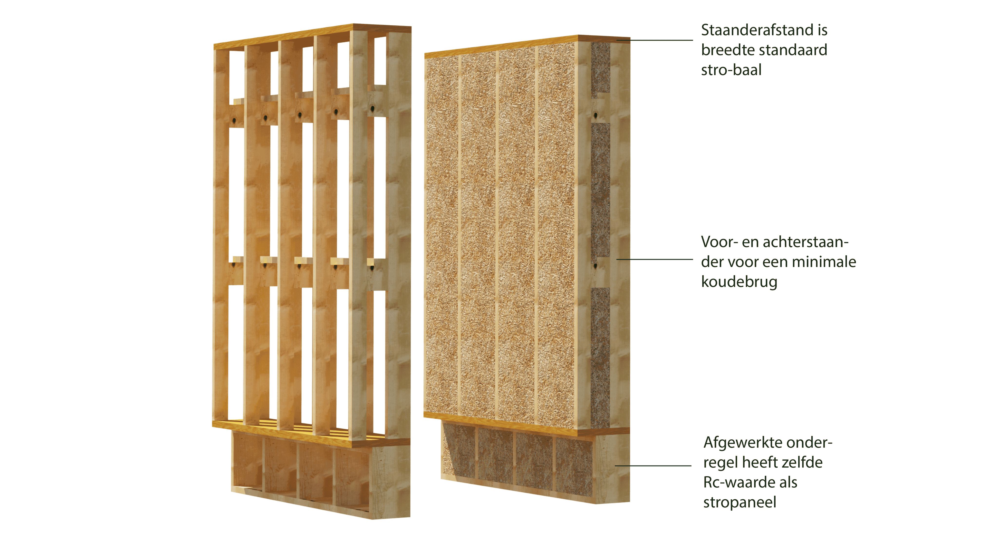 Het onderste deel van de panelen (plint) is 10 cm smaller en geïsoleerd met houtvezel, waardoor het stro beschermd wordt tegen optrekkend vocht én er extra vloeroppervlak ontstaat.