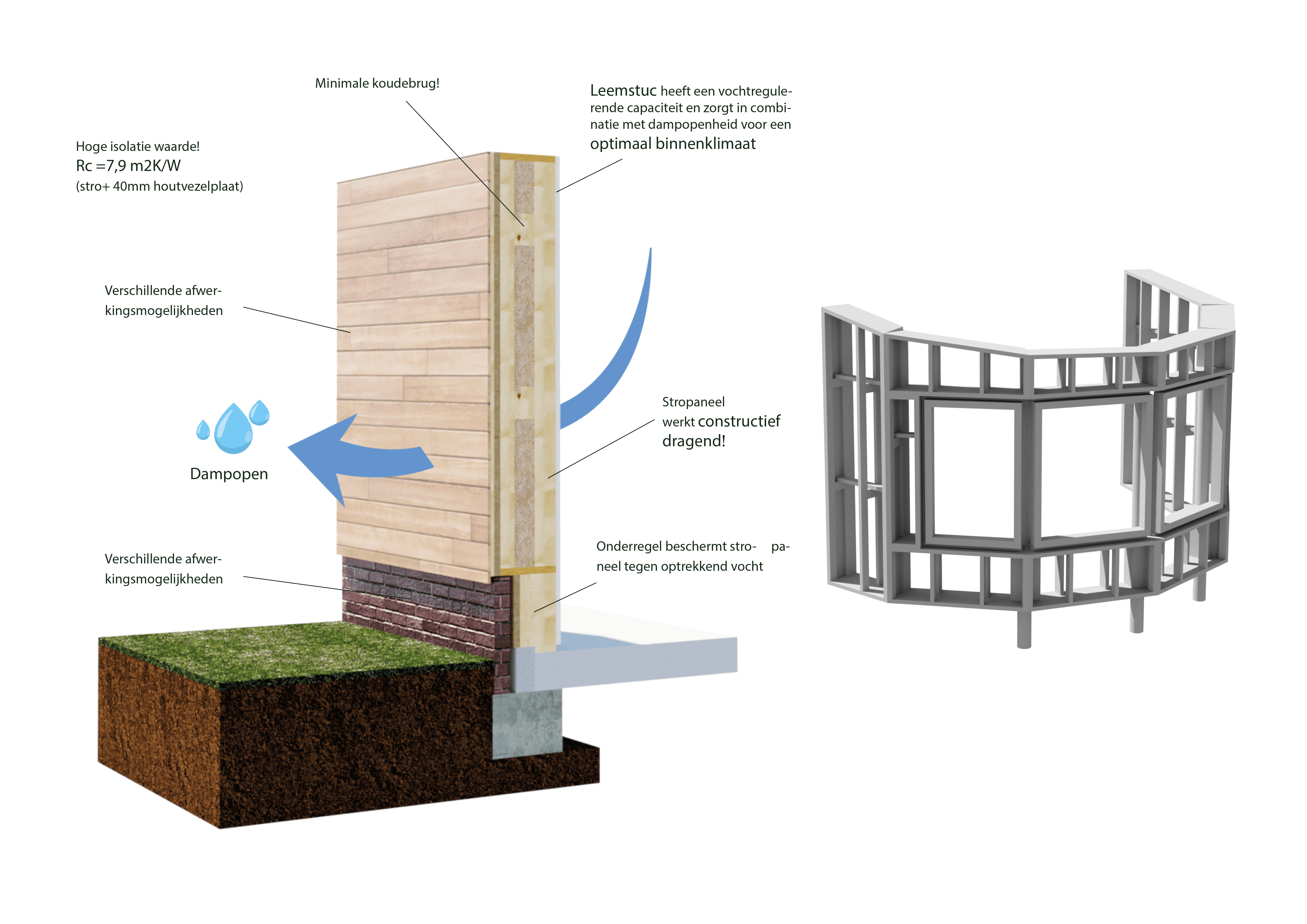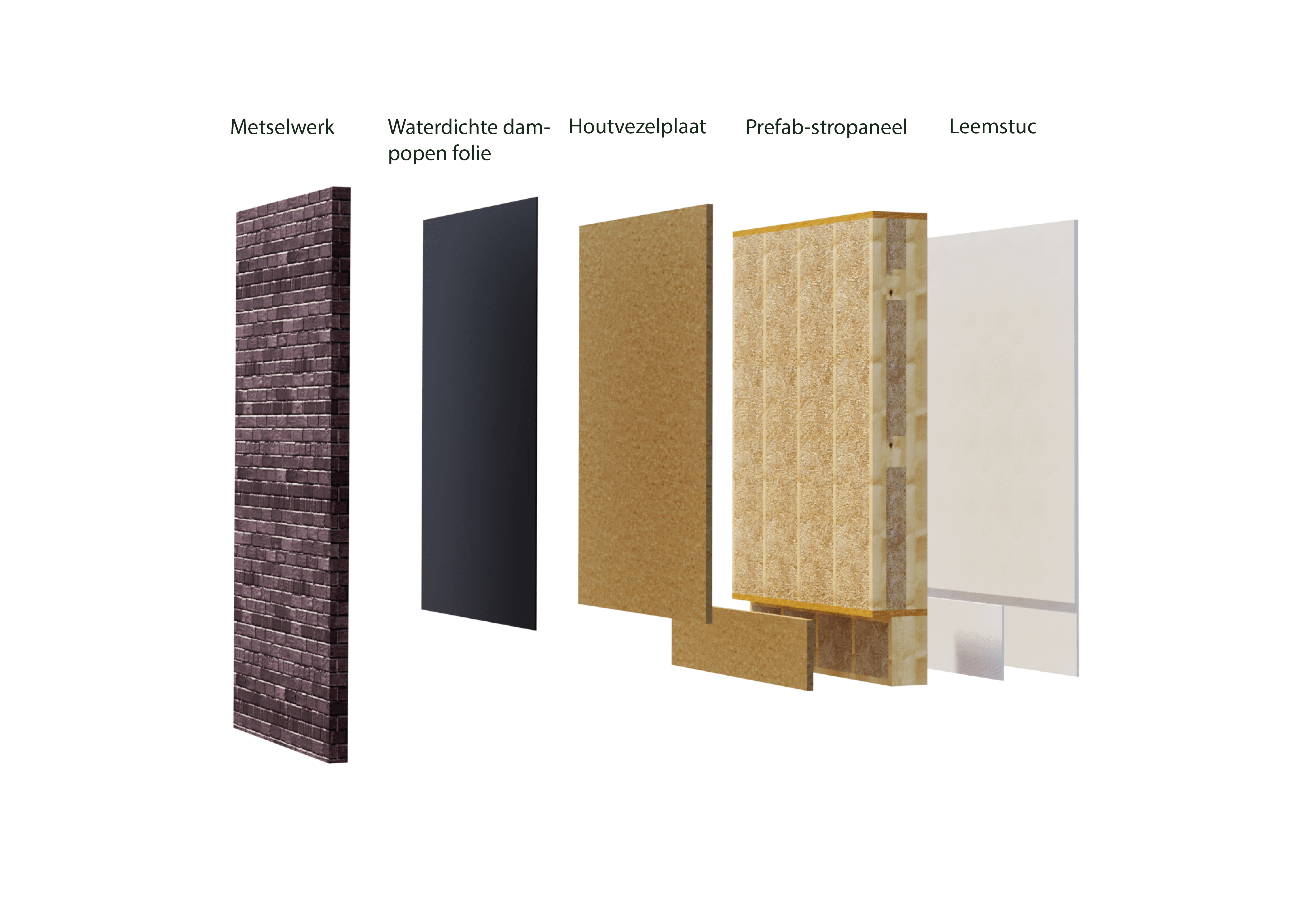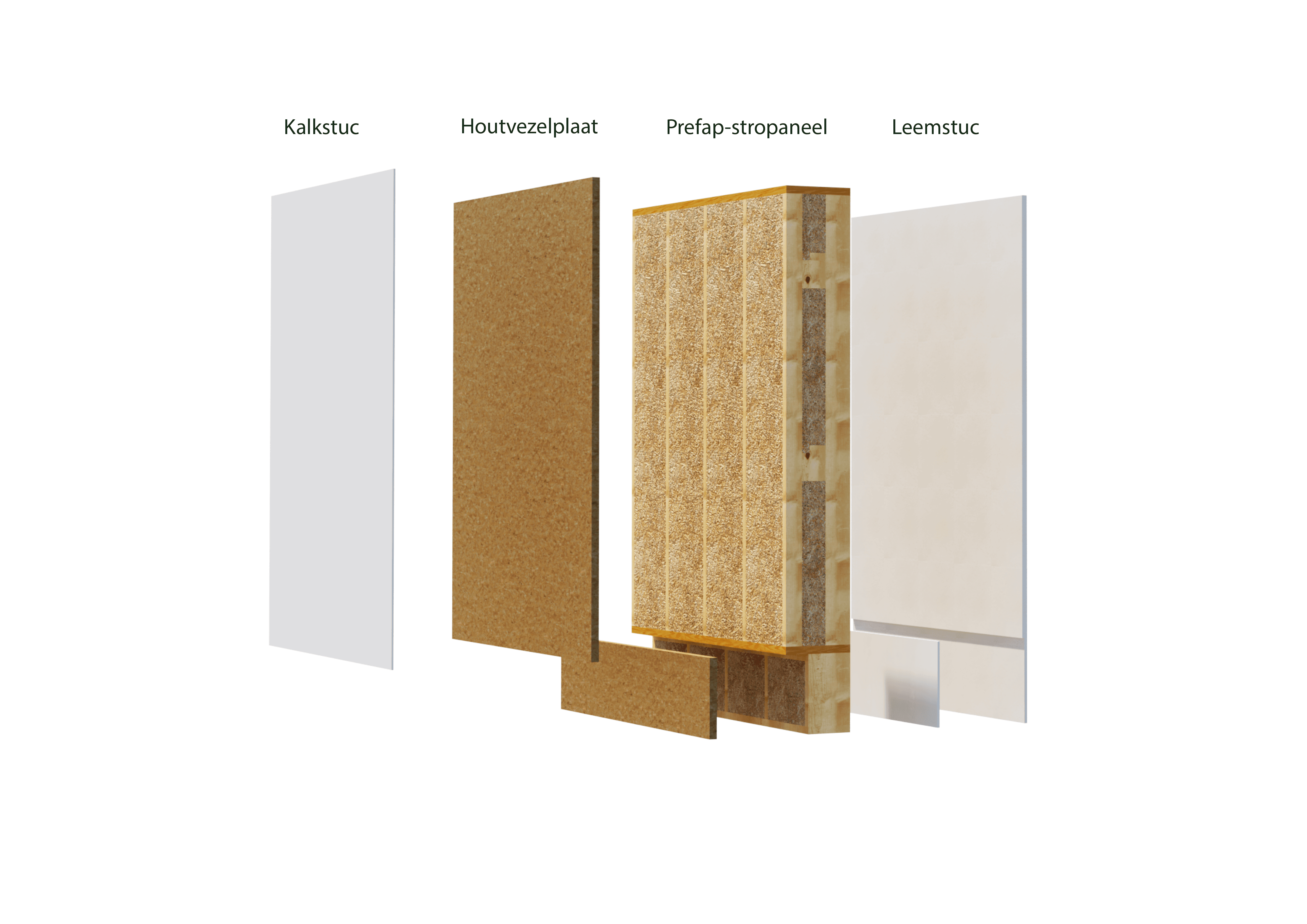 Bouwen met stro gaat nog sneller met prefab stropanelen. Deze panelen worden aan de binnenzijde afgewerkt met leemstuc of Fermacell (gipsvezelplaat), beide dampopen. Leem reguleert bovendien het vocht uitstekend, waardoor het binnenklimaat natuurlijk gezond en constant blijft. Let op: leem kan alleen met minerale verf worden beschilderd.
