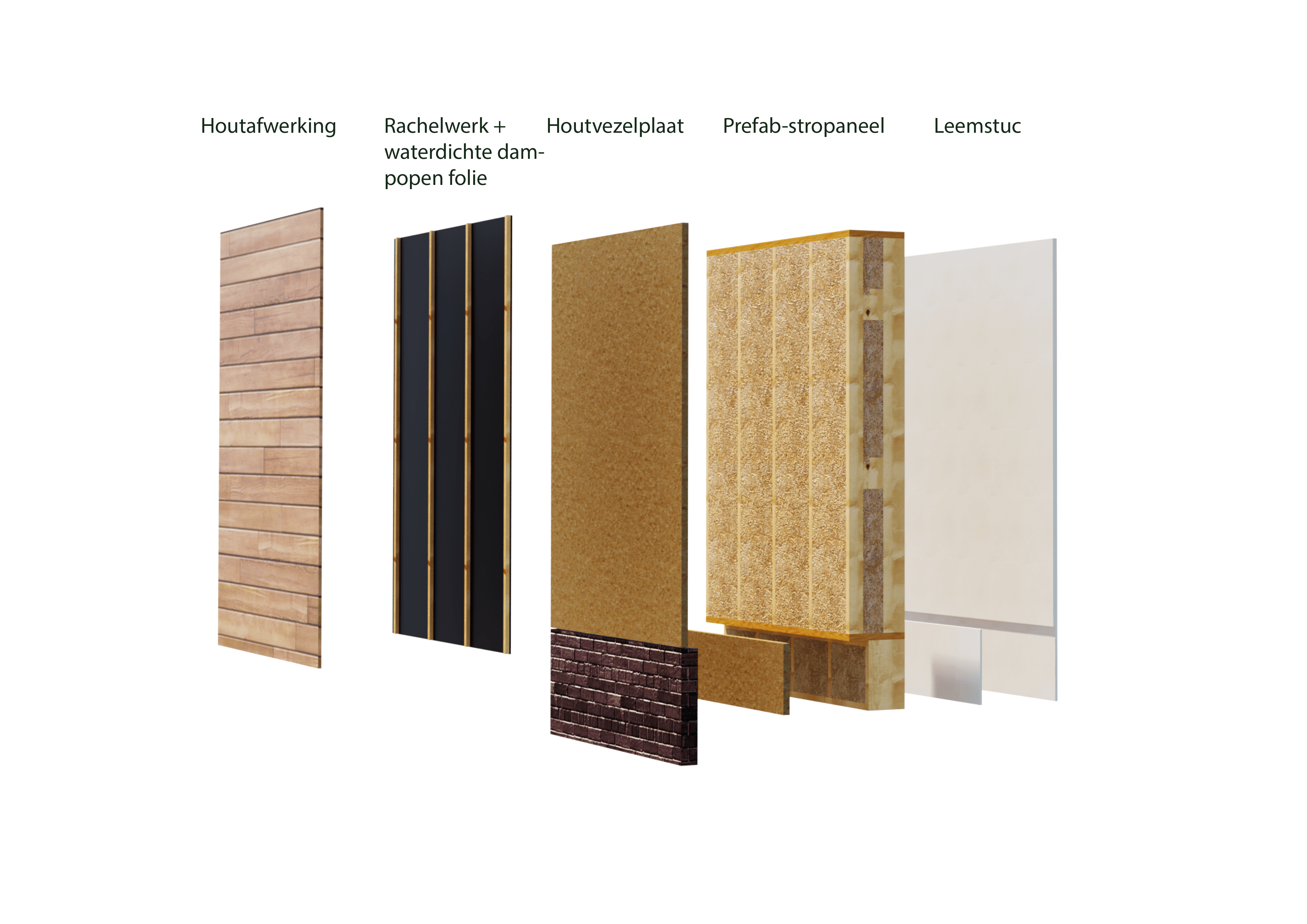 Aan de buitenzijde zorgt een 40 mm messing-en-groef houtvezelplaat voor extra isolatie en winddichting. Afwerking kan met hout, kalkstuc, metselwerk of vliesgevelconstructies, waardoor prefab stropanelen flexibel inzetbaar zijn in diverse ontwerpen.